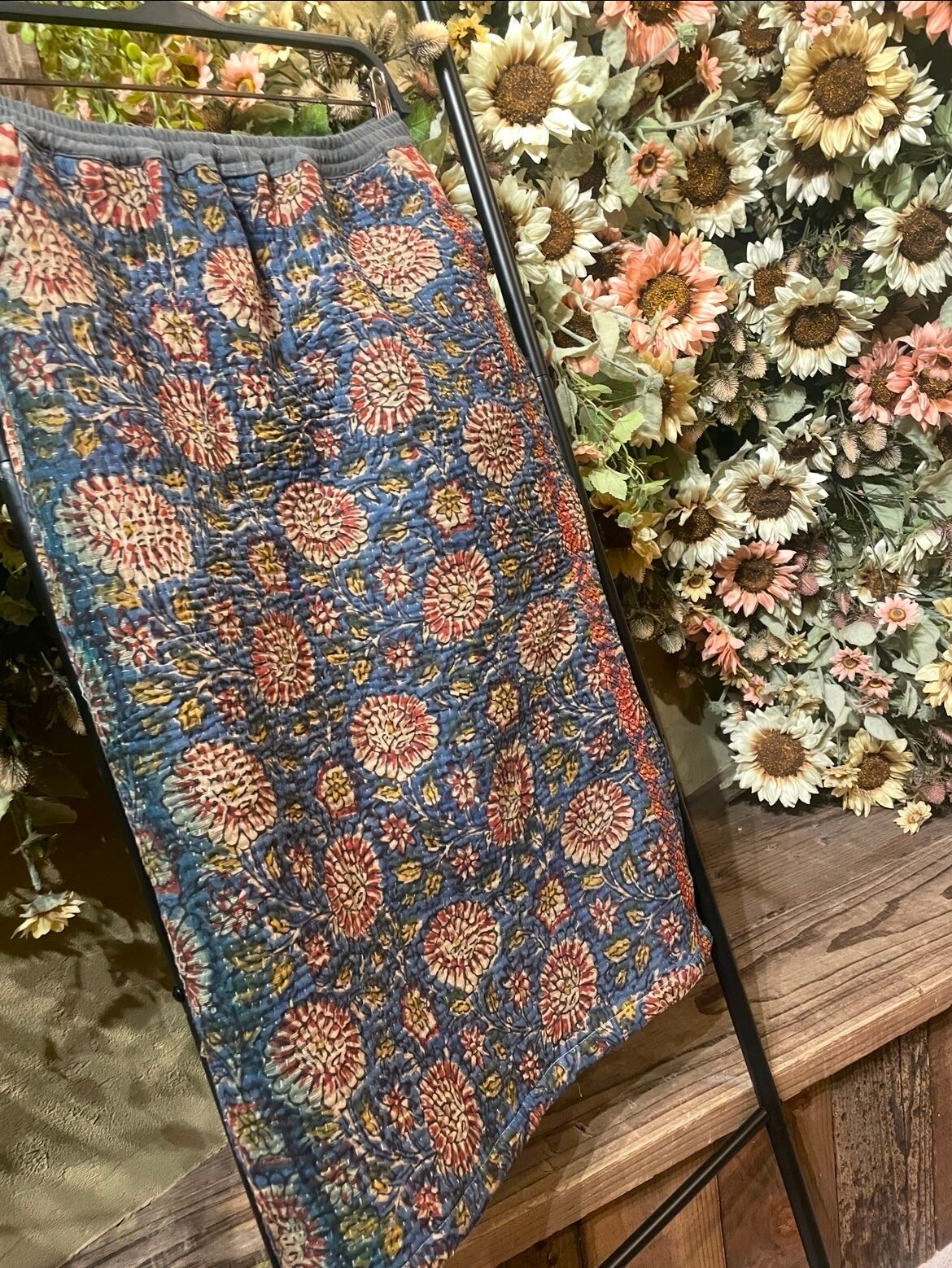 全て手作業で仕上げられたカンタキルトのこのスカートには、独特の刺し子が施されています。手作りならではの温かみが、着る人の個性を引き立て、どれもが唯一無二の存在です。ネイビーの地に映える個体差のあるデザインも楽しめます♡