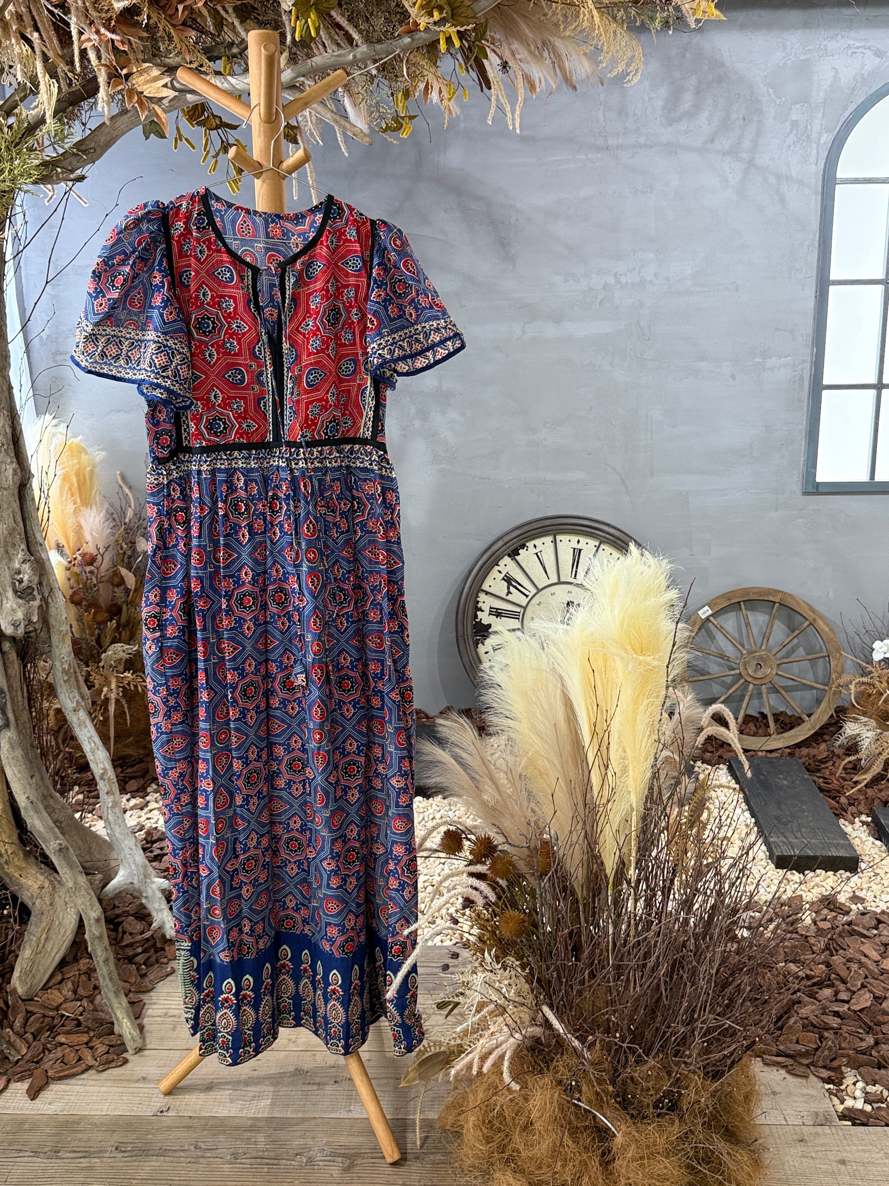 ネイビーブルーにレッドの幾何学が映える、レトロエスニックな一枚。
