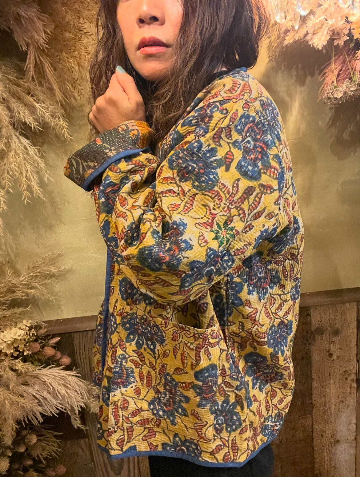 まったく同じものは存在しないため、特別感のある1点ものとして大切にしていただきたい一着です。 サイズ ・着丈 65cm ・見頃 55cm ・素材 コットン100% ・MADE IN INDIA ※採寸は平置きで行っておりますので、ハンドメイドのため個体差や多少の誤差が生じる場合がございます。ご了承ください。 その他 * 色合いや模様には微妙な個体差がございますので、特別な一着としてお楽しみいただければ幸いです。 * 摩擦や汗、雨などによる色移りの可能性があるため、淡色の衣料品との組み合わせはお控えください。見た目や質感についても、できる限り現物に近い写真を掲載しておりますが、ブラウザの影響で見え方が異なる場合がございますことも、あわせてご了承ください。 オシャレで機能性も兼ね備えたこのショート丈イエロー大きめ花柄をぜひ手に入れて、あなたのスタイルに新たな魅力を加えてみてはいかがでしょうか✨ 本製品はヴィンテージカンタキルトのため、生地が繊細です。サリーや古布を重ねた生地を使用しているため、使用感や経年劣化がございます。細かいダメージ箇所をすべて表記するのは難しいため、ヴィンテージカンタキルトにご理解の上ご検討ください。ヴィンテージのため、シミやほつれ、布のすり減り、小さい穴などがある場合があります。また、アジュラック染めの色むらが多少ありますが、それが手作業ならではの魅力としてお楽しみいただけます。